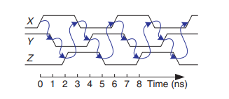 이 회로는 불안정적인 회로이다. 각 인버터의 Propagation Delay가 1ns일때 다음과 같은 반응을 보인다.
