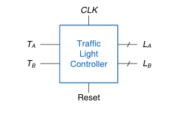 사거리에 차량을 감지하는 센서 Ta/Tb, 신호등 La/Lb , 5초 주기의 Clock, Reset Button을 이용해서