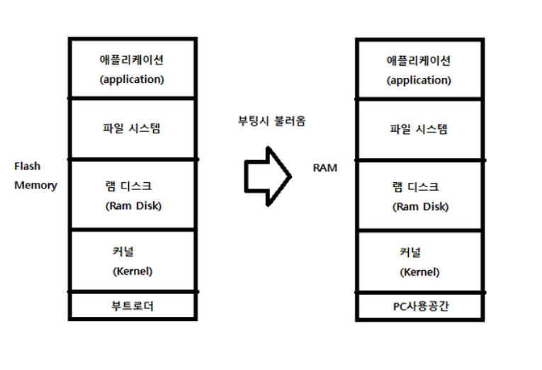 부팅시 플레시 메모리에 있는 메모리를 RAM으로 불러오고 RAM에 저장된 파일들이 실행되어 OS가 동작한다.
