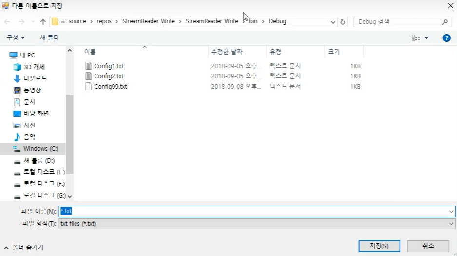 //StreamWriter로 객체를 만들면 생성자에 저장할 파일 이름과 경로까지 전부 줘야한다.